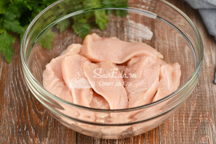 Второй вариант. Филе куриной грудки (500 г) нарезаем на не очень тонкие ломтики и выкладываем в миску.