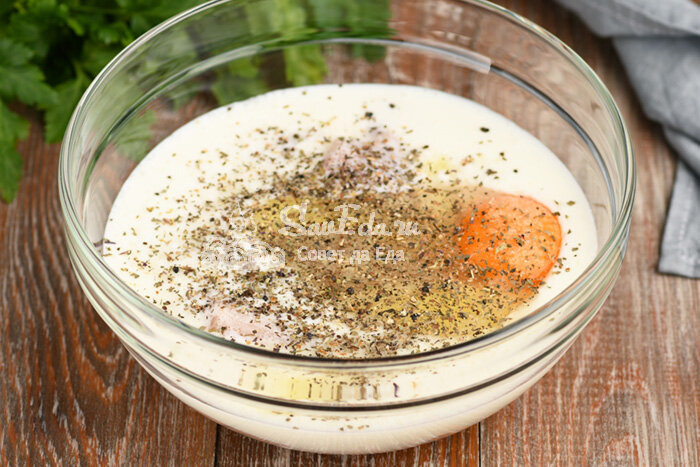 Вливаем кефир (200 мл), разбиваем одно куриное яйцо, добавляем соль, сушеный базилик (2 щепотки) и молотый перец.