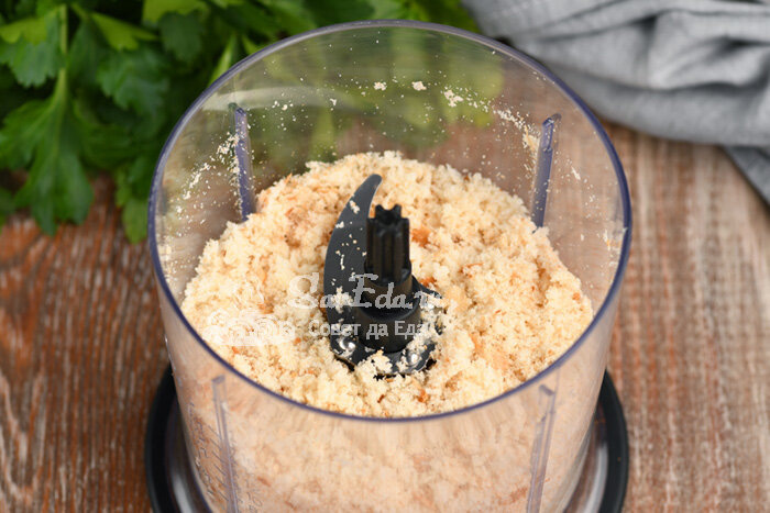 Для панировки перестала использовать панировочные сухари, готовлю ее быстро из обычного хлеба или батона (они могут быть свежими или черствыми). Ломтики батона (7 шт.) разламываем на более мелкие кусочки и отправляем в чашу блендера. Измельчаем и панировка из хлеба готова. Крошку подсушивать не надо.
