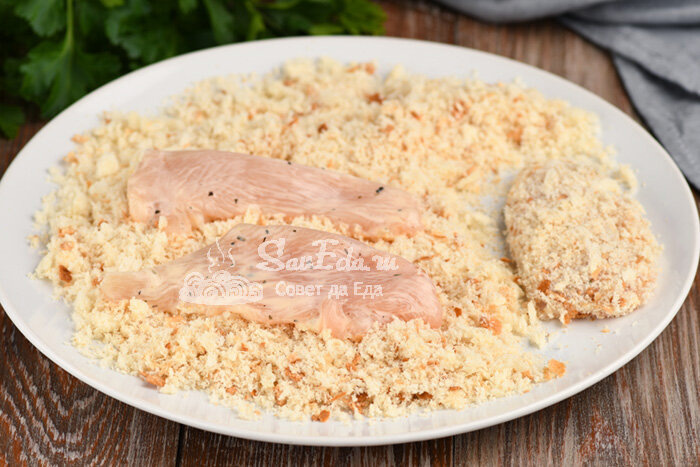 Кусочки курицы вынимаем из маринада, слегка отжимаем и выкладываем в крошку. Обваливаем и слегка ее прижимаем пальцами. Крошка прекрасно фиксируется на мясе и не осыпается.