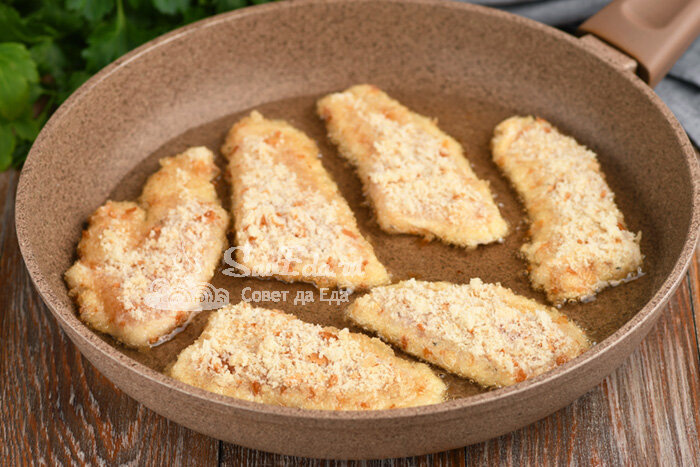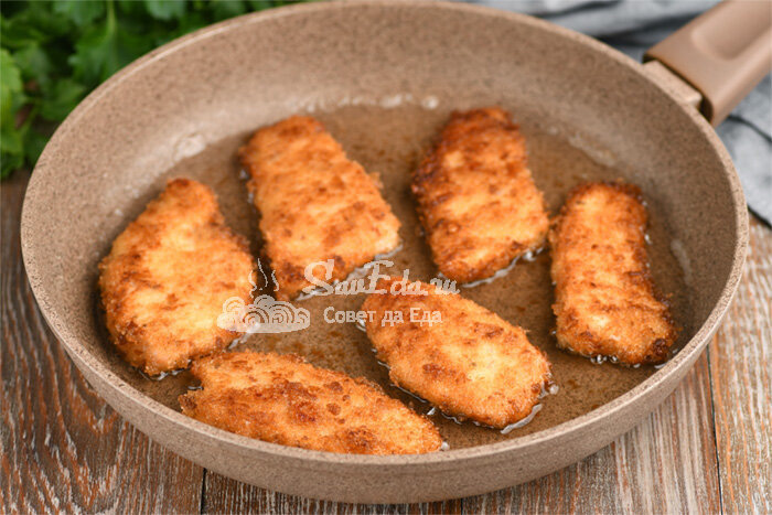 Плюс этой панировки еще в том, что крошка почти не осыпается в масле, а значит не горит. В одном масле можно готовить 3-4 партии. Еще при жарке масло не брызжет во все стороны. Вынимаем филе и готовим следующую партию.