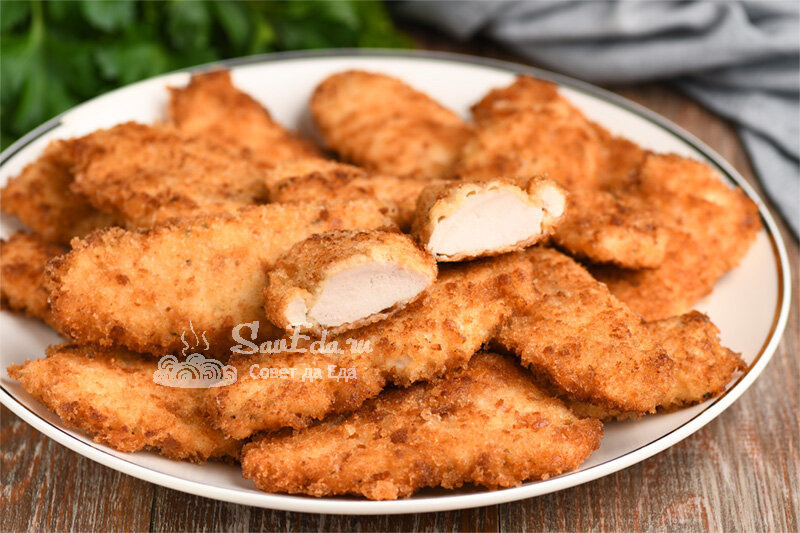 Панировка плотно прилегает к мясу и не дает сокам вытекать наружу. За счет панировки и кефирного маринада кусочки грудки получаются не просто нежными, а невероятно нежными, они просто тают во рту. Грудка сочная, вкусная, а сверху покрыта хрустящей корочкой (хруст мягкий).