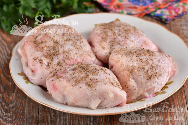 Третий вариант. Для приготовления можно брать любые куриные части (4 шт., у меня бедра). Бедра промываем, со всех сторон солим и перчим.