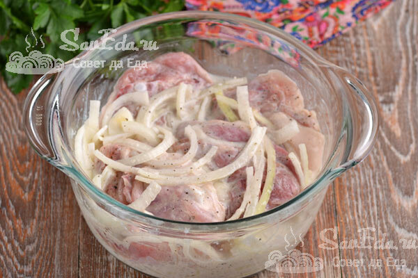 В миску добавляем нарезанный полукольцами репчатый лук (1/2 часть от большой луковицы, лук слегка жмем), куриные бедра, кефир (200 мл) и перемешиваем. Размещаем бедра кожей вниз. Закрываем и отправляем в холодильник минимум на 4 часа (можно оставить на ночь).