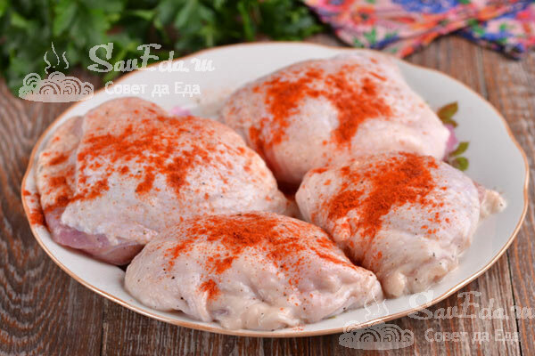 Затем бедра выкладываем на тарелку кожей вверх, посыпаем сладкой паприкой (1 ч. л. без горки) и распределяем по всей поверхности.