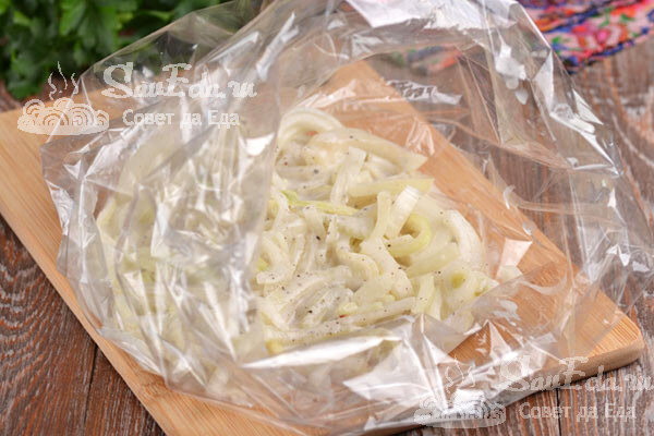 Часть рукава для запекания отрезаем от рулона, скрепляем один конец. Размещаем лук и выливаем жидкость, которая осталась в миске.