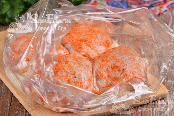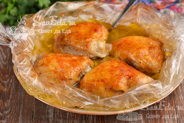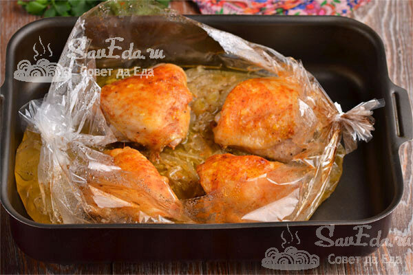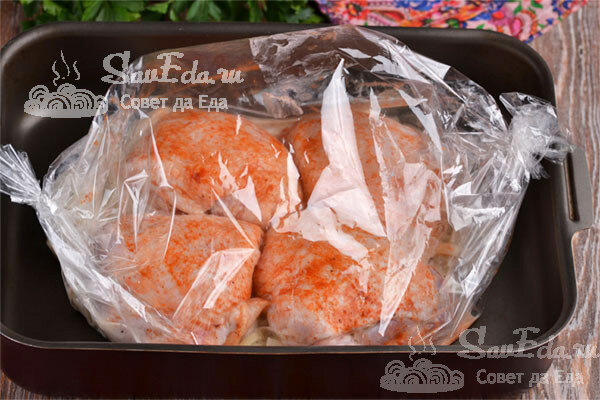 Другой конец рукава скрепляем, перекладываем курицу с луком в форму или на противень и делаем прокол ножом на пленке. Отправляем бедра в разогретую до 180 градусов духовку и запекаем 45-50 минут.