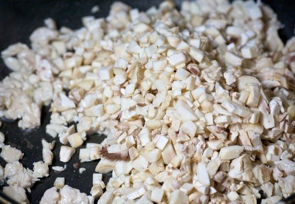 Пока жарится курица,мелко нарезаем ножки шампиньонов.Добавляем ножки грибов в сковороду к курице и жарим ещё минут пять.