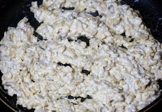 Смешиваем муку со сметаной ,уменьшаем огонь и вливаем сметану в сковороду.