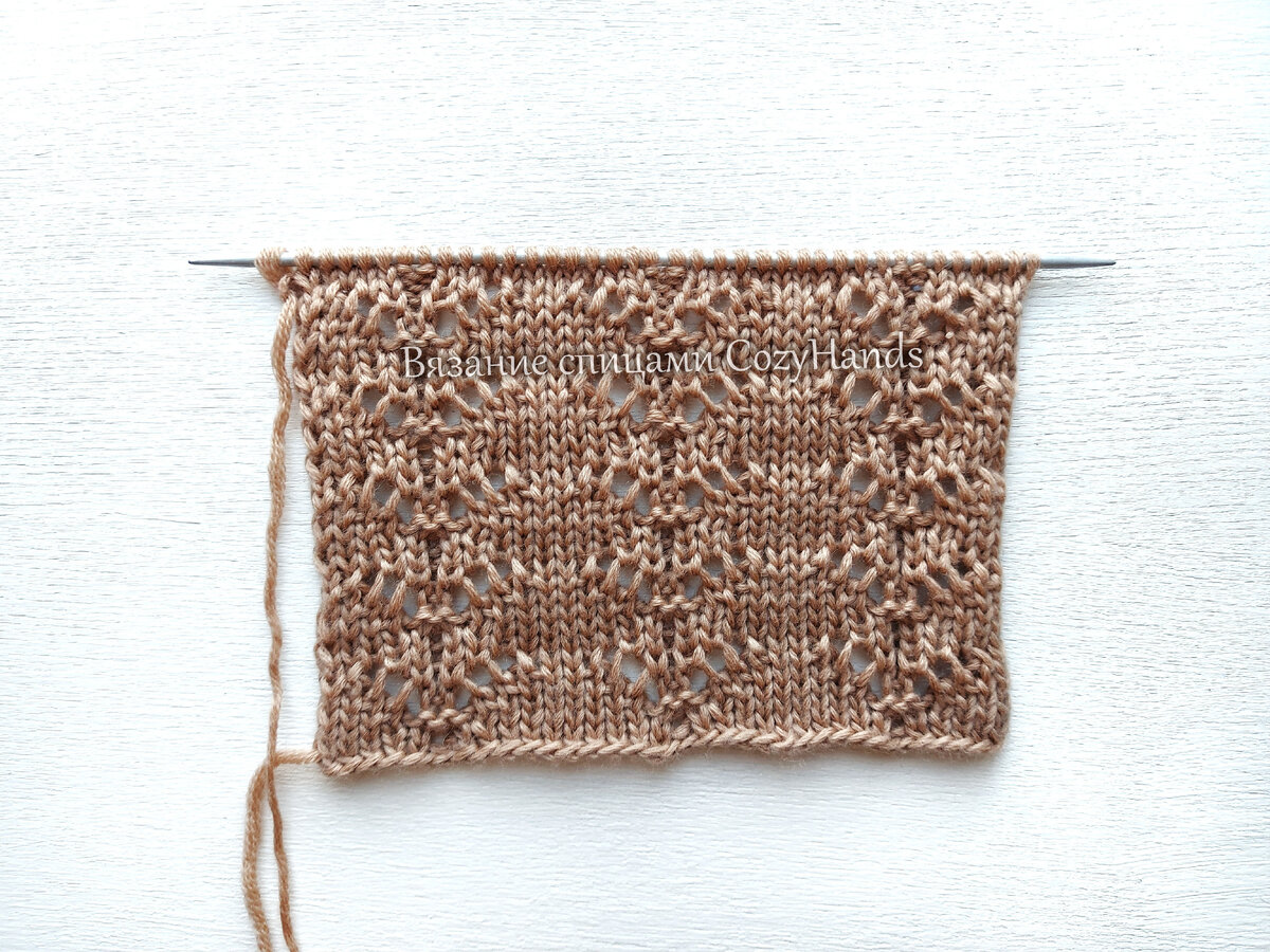 Можно увеличить расстояние между ажурными элементами, добавляя изнаночные петли между раппортами.