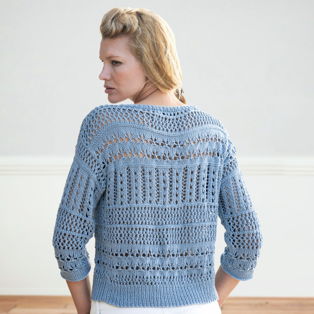 Для вязания нам потребуется 350 (400) 450 г пастельно-голубой пряжи: 65% хлопок, 25% вискоза, 10% лён; 110 м/50 г. Прямые спицы № 4 и 4,5. А также круговые спицы № 4.