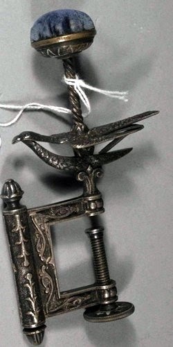 [320x307]Сейчас такие игольницы стали предметом коллекционирования или винтажным элементом декора. Состоит этот элегантный аксессуар для рукодельниц из фарфоровой половинки куклы (half dolls), снабженной отверстиями по нижнему краю. Именно к этим отверстиям пришивается игольница, которая сверху зарывается красивой юбкой. Иногда к игольнице пришиваются изящные фарфоровые ножки. Именно такая немецкая игольница в голубом платье с оборками украшала швейный уголок моей мамы. Было очень красиво!