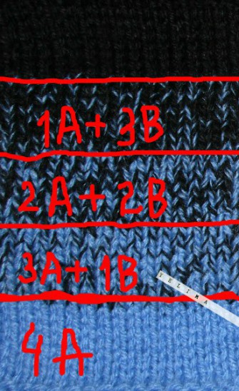 Однако, скомбинировать 2 разных по цвету нити можно в разных пропорциях:например, голубого цвета, обозначенного буквой А-можно взять больше(скажем, 70%), а чёрного(обозначим буквой В)-только 30%.В этом случае перевес цвета будет в сторону голубого. (светлый меланж).