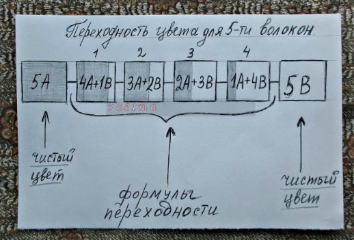 Затем начинаем переходность. Возьмём 3 волокна цвета А + 1 волокно цвета В, соединим их вместе. Формула запишется как 3А+1В.