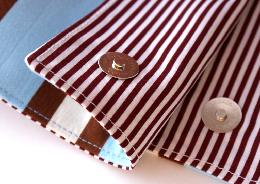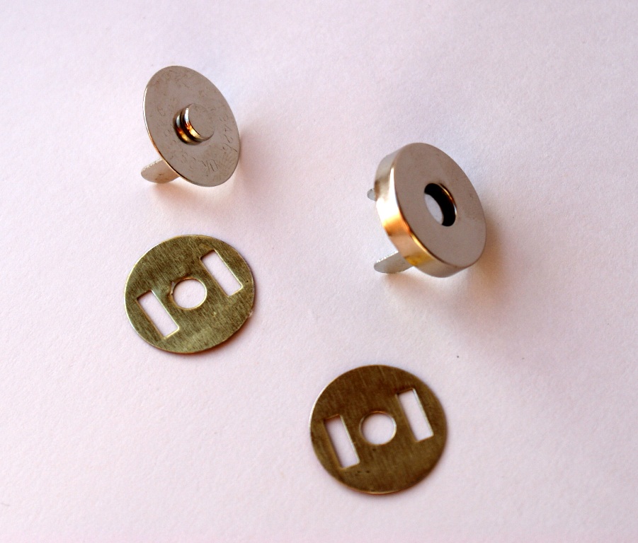 Магнитная кнопка состоит из двух частей, к каждой части прилагается металлический «блинчик» для закрепления кнопки с обратной стороны ткани.