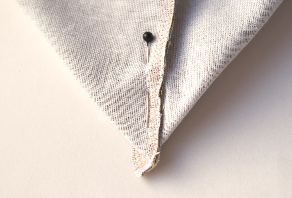 Прошиваем, закрепляя строчки на концах, для верности можно прошить два раза, обрабатываем край зиг-загом, уголок срезаем. Получаем вот такой уголок.