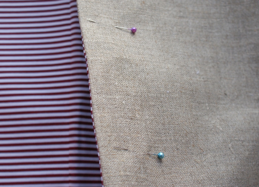 Приколите клапан булавками. Я так же проложила по краю строчку, что бы быть уверенной, что детали не сместятся при выворачивании и сшивании.
