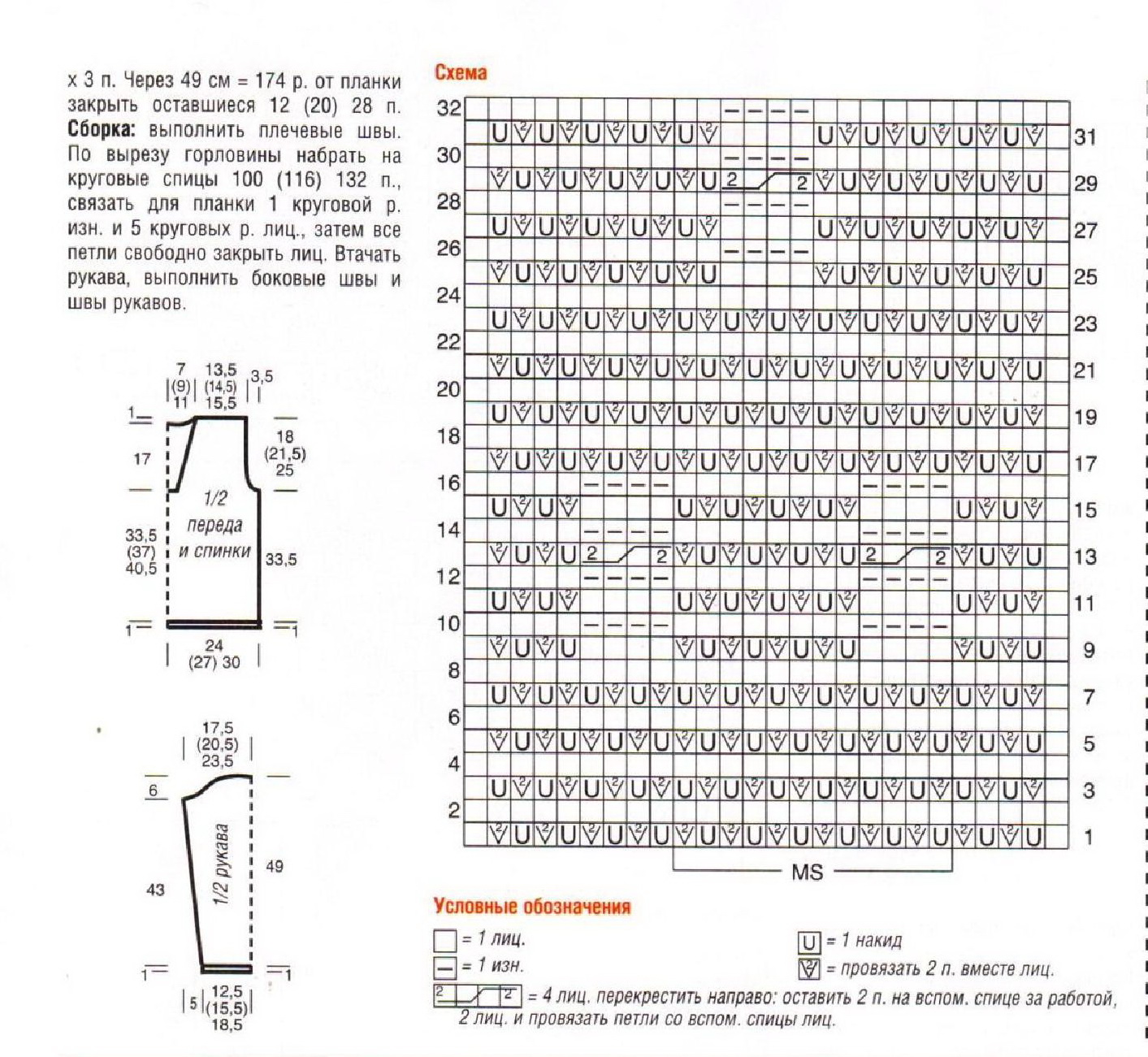 на спицы № 4 набрать 80-90-98-108-118 п. и вязать резинкой 1/1, при этом начать с 1 изн. р. и после кром. с 1 изн., 1 лиц. Через б см продолжить вязать на спицах № 4,5 основным узором, при этом выполнять 39-44-48-53-58 раппортов. На высоте 37 см от начала работы для пройм закрыть с обеих сторон по 2 п. и вязать следующим образом: кром., 4 п. лиц. глади, 66-76-84-94-104 п. основной узор, 4 п. лиц. глади, кром. Для скосов реглана в каждом 2-м р. убавить 17-18-20-22-24 раза поочерёдно по 1 или 2 п., выполняя особые убавления 1 или 2 = 26-32-34-38-42 п. На общей высоте 55-56-58-60-62 см оставшиеся петли свободно закрыть.