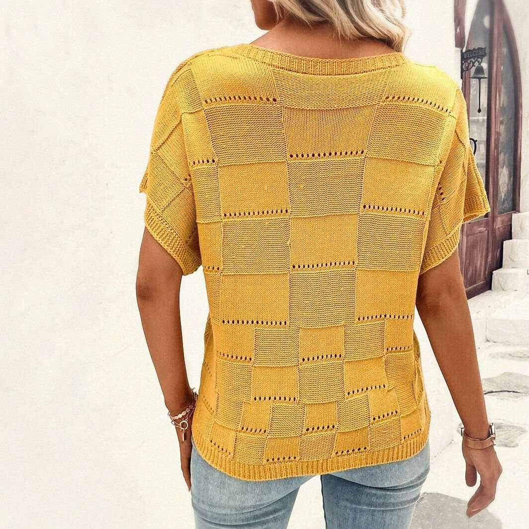 Интересный, но очень простой в исполнении летний топ в ярком оттенке жёлтого. Модель выполняется двумя деталями переда и спинки с цельновязаными "рукавами".