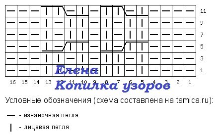 Отличный узор в этой модели. Так как он вертикальный, то будет стройнить. При этом вяжется узор не сложно, раппорт 16 петель и 12 рядов. Четные ряды по рисунку. Схему узора составила, она под фото.
