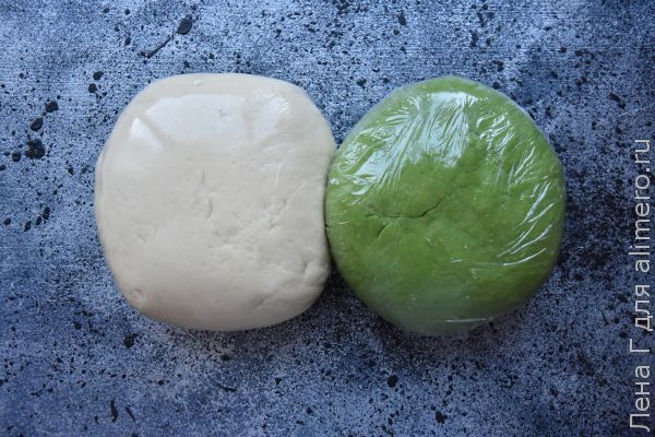 Приготовить поочередно белое и зеленое тесто.