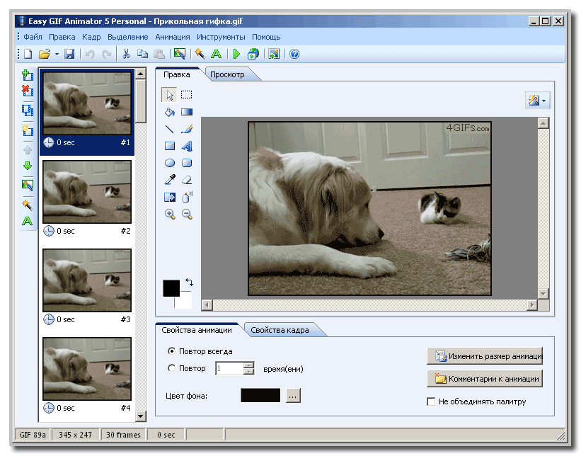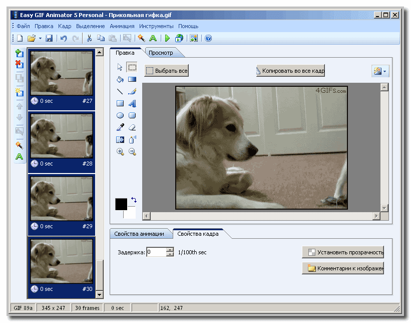 3. С помощью программы Easy GIF Animator создаем новую анимацию из полученных кадров.