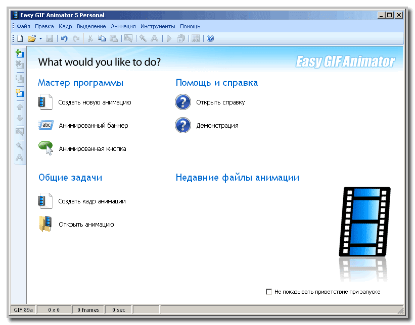 При входе в программу мы видим приветствие(если Вы его не отключили):