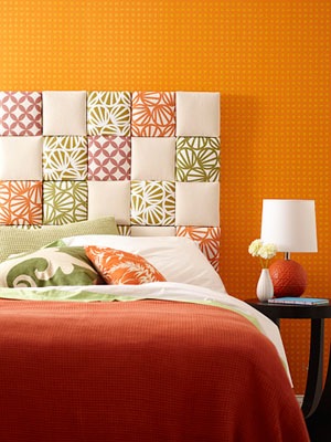 Популярная идея — оформление изголовья кровати мозаикой: это могут быть как тканевые квадраты, так и просто окрашенные деревянные, пластиковые или из любого другого материала.