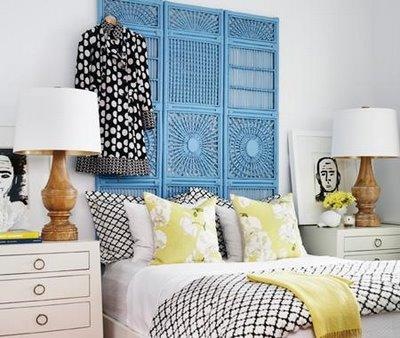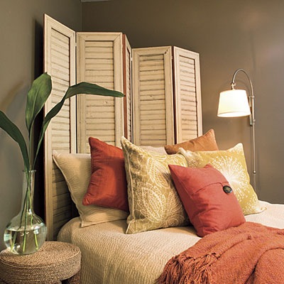 Очень необычно будет смотреться изголовье-ширма. Также изголовье ширму можно сделать из обычных жалюзийных дверей, продающихся в любом строительном магазине.