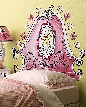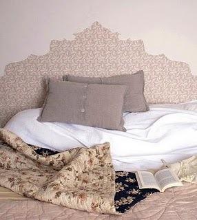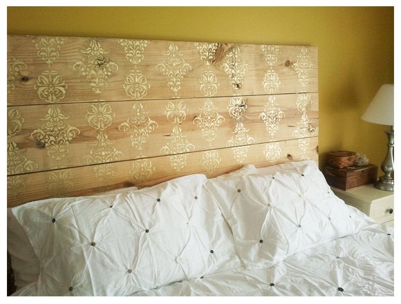 Свежая идея — имитация изголовья. Вы можете нарисовать, то что подходит в вашу спальню с помощью трафарета!