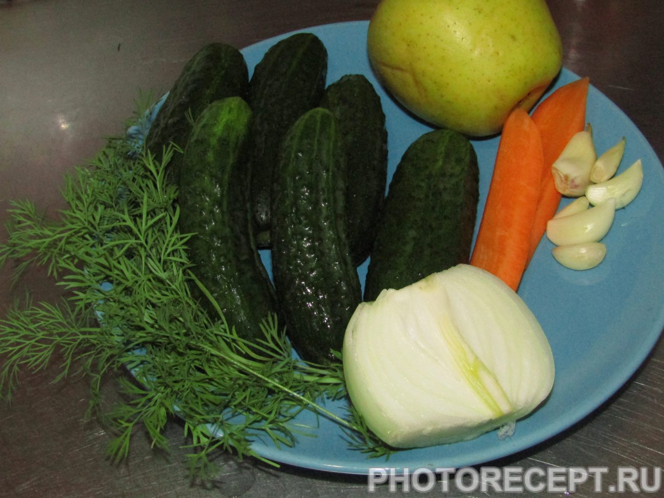 Подготовка продуктов не составит труда. Огурцы промываем под проточной водой , обрезаем с двух сторон ~по 2 мм. морковь очищаем от кожуры. Чеснок делим на зубочки. Лук очищаем и тоже моем.