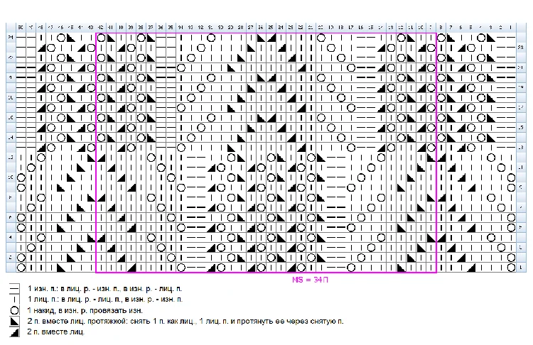 Раппорт узора на схеме выделен рамкой и составляет 34 петли по ширине полотна и 24 ряда по высоте.