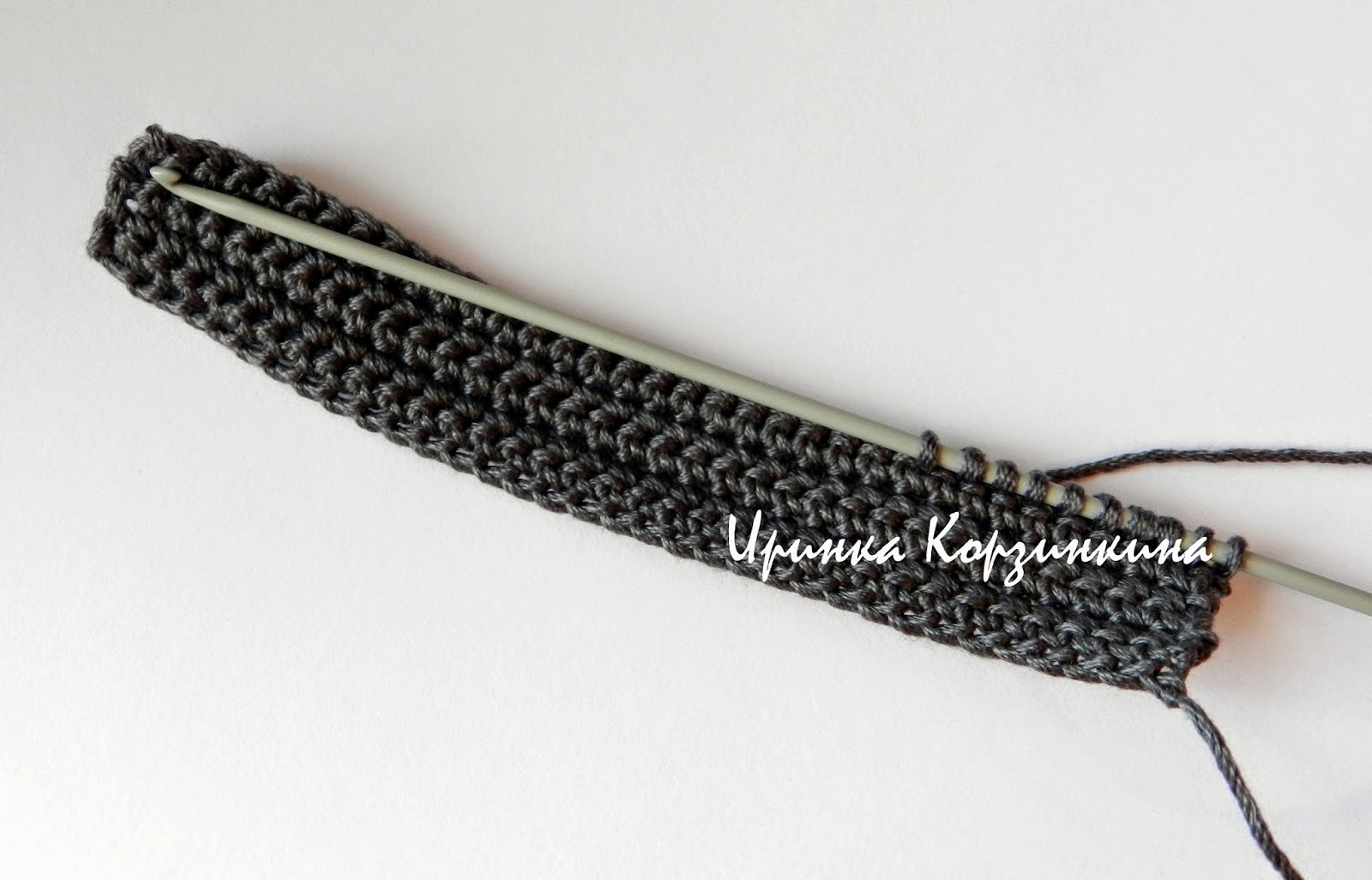 Начинаем работать крючком. Набираем цепочку из 34 петель, плюс 1 петля подъема (35 воздушных петель). Вяжем полоску на 34 петлях пять рядов. Далее набираем петли на спицу за передние дольки петель - 34 петли плюс 2 кромочные (всего 36 петель на спице).