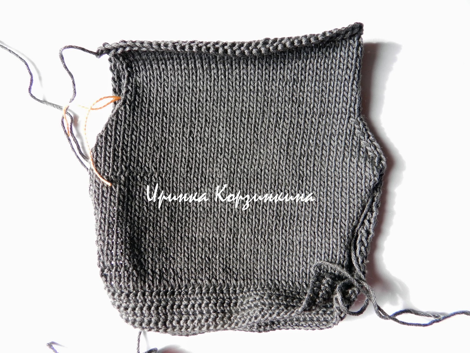Провязываем изнаночный ряд. Ставим маркеры (цепляем обрезки ниток) в начале и в конце ряда. Дальше будем вязать без изменений еще 14 рядов.