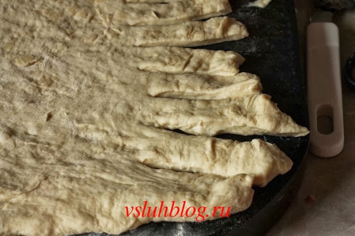 Поднявшееся тесто верните к первоначальному размеру и переложите на слегка присыпанную мукой рабочую поверхность. Раскатайте в пласт. С двух сторон сделайте надрезы похожие на полоски.