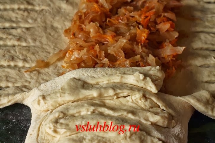 В данном рецепте была использована тушеная капуста. Для ее приготовления капусту нужно нашинковать мелко, присыпать немного солью и помять руками для получения большей сочности. Дальше добавить лук, морковь, растительное масло и готовить до мягкости. Если жидкость совсем испарится, можно добавлять по чуть-чуть воду.