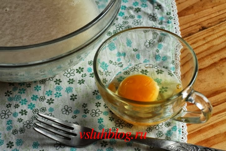 Разбейте яйцо в небольшую посуду и немного взбейте. Добавьте в дрожжевую смесь.
