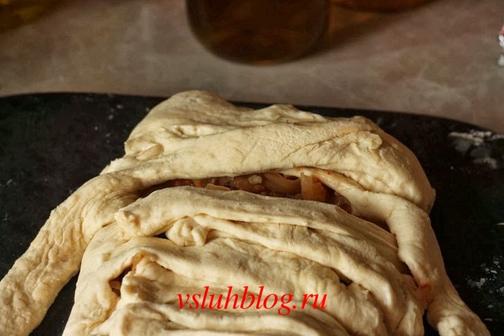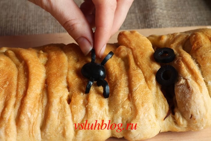 Выложите на середину начинку, и поочередно перекладывая полоски, сделайте мумию. Небольшое примечание: начинку для этого блюда к Хэллоуину пирог "Мумия" можно брать самую разную. Очень хорошо подойдет наполнение для пиццы, включая сыр.