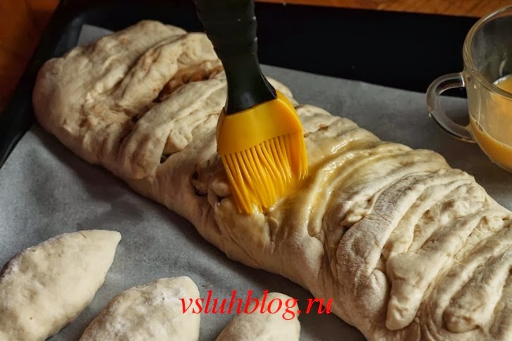 Переложите пирог на противень и оставьте на 20-30 минут для расстойки. Перед выпеканием смажьте поверхность взбитым яйцом. Выпекайте при 200 гр до аппетитной корочки.