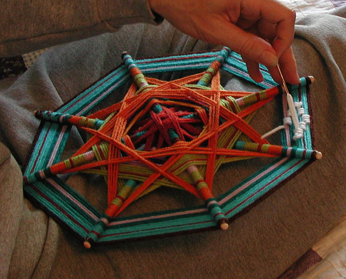 На больших мандалах это видно лучше, чем на маленьких. По мере роста мандалы, верхние рейки прижимаются книзу, а нижние – загибаются кверху. К моменту, когда вы доберетесь до границы ojo, изделие станет более плоским, чем в середине или начале процесса. Если вы используете слишком тонкие или слишком гнущиеся рейки, верхние загнутся даже БОЛЬШЕ нижних. Это может произойти, если, скажем, вы использовали 6-миллиметровые рейки для 45-сантиметрового 12-угольного ojo. Так, я сломал несколько реек в процессе изготовления ojo, потому что на них давила пряжа.