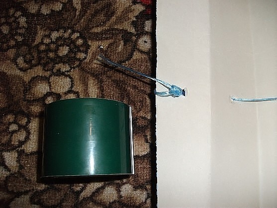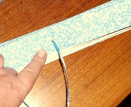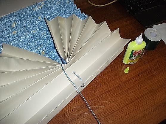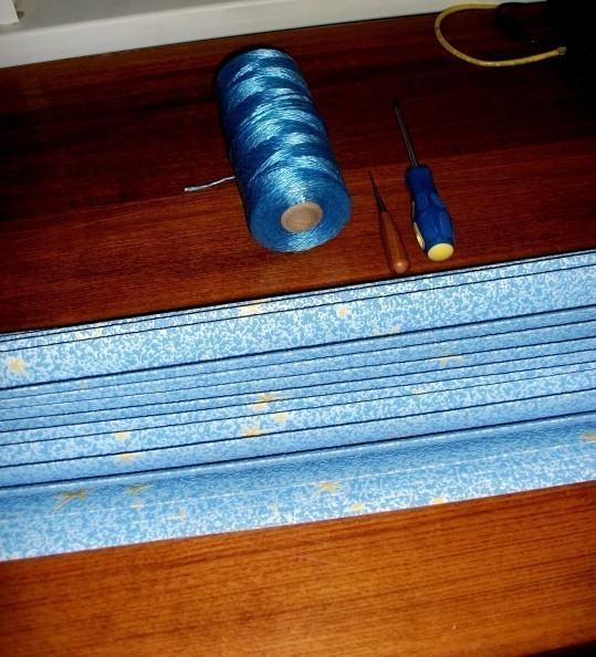 В дырочку проденьте шнурок. Расправив ваши жалюзи, закрепите его с двух сторон с помощью скотча. В качестве шнурка можно использовать нейлоновую веревку.