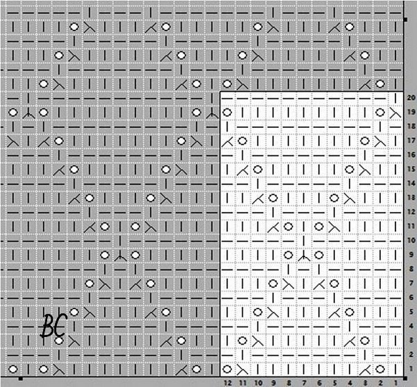 Условные обозначения: в основе узора платочная вязка,вертикальная и горизонтальная штриховка - лицевые петли. O - накид,в изнаночных рядах вязать изнанкой. Треугольник с наклоном вправо: 2 петли вместе лицевой. Треугольник с наклоном влево - протяжка: одну петлю снять,не провязывая на правую спицу,затем лицевая и надеть на неё снятую петлю. В схеме даны лицевые и изнаночные ряды!