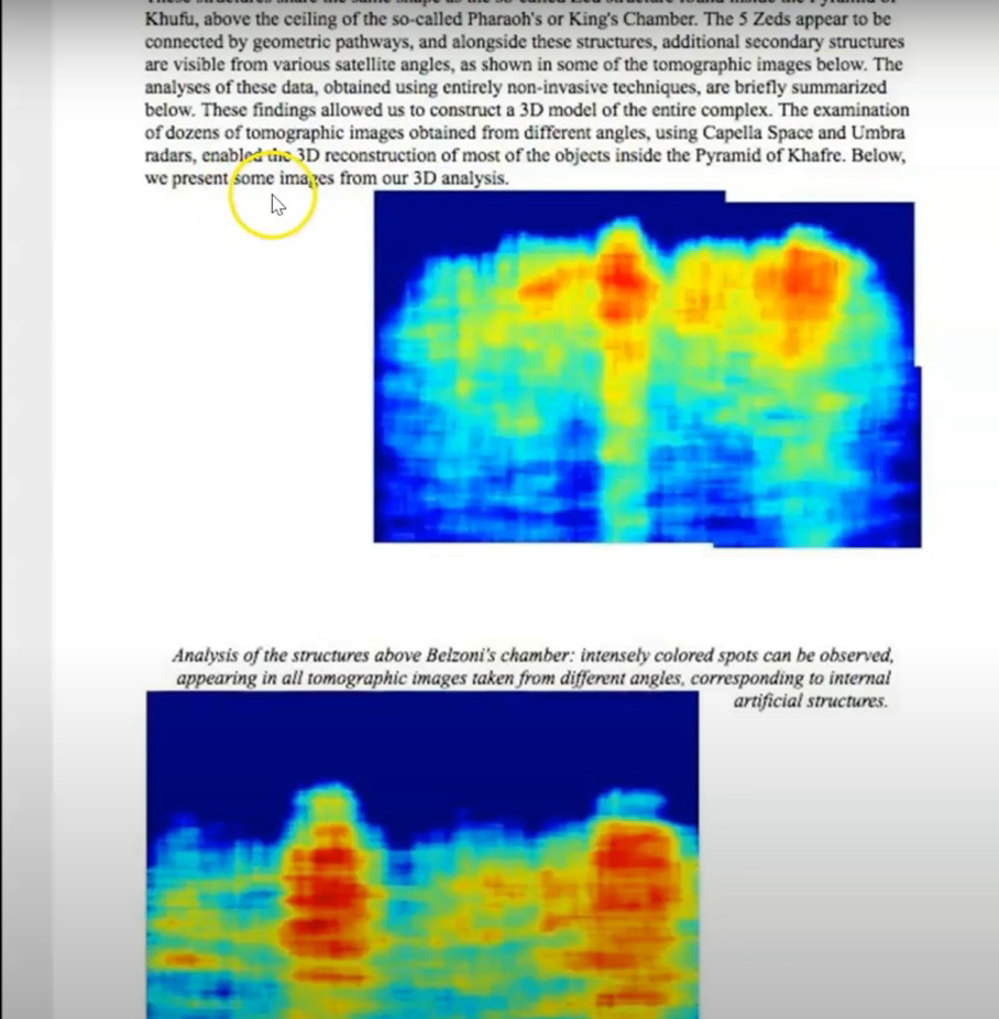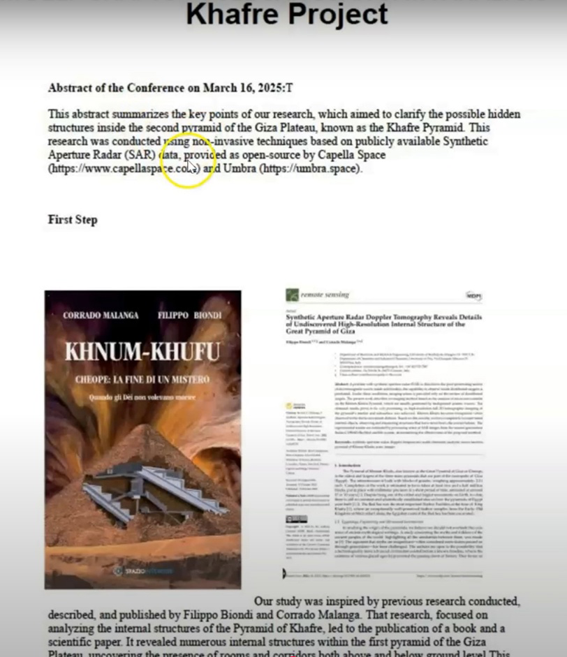 Страница из тезисов Коррадо Маланги и Филиппо Бионди: "анализ десятков томографических изображений, полученных под различными углами, используя радары Capella Space и Umbrella, позволил получить 3D-реконструкцию большинства объектов внутри пирамиды Хафра"