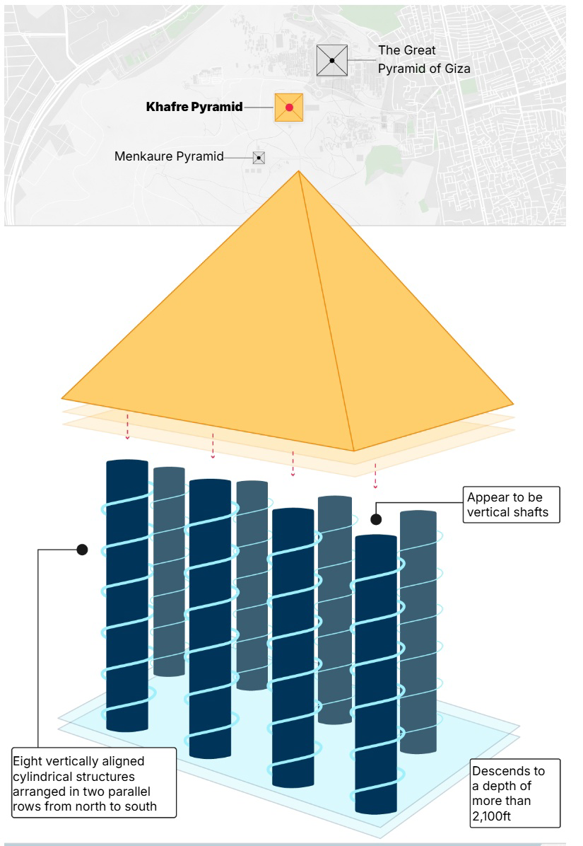 В пирамиде Хафра, второй по величине пирамиде Гизы, обнаружили 5 неизвестных структур, а под ней — 8 цилиндрических колодцев, окруженных спиральными дорожками. Колодцы уходят под землю на 648 метров, где сливаются в две большие кубические структуры, и всё это простирается на 2 км под поверхностью плато. Новое открытие перевернуло официальную историю.