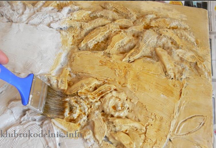 11. После высыхания сделаем окончательную отделку. Коричневой глинкой, размешанной в воде или шеллаком покроем весь барельеф, чтобы краска подчеркнула детали. После высыхания можно процедуру еще раз повторить, чтобы цвет был более насыщенный.