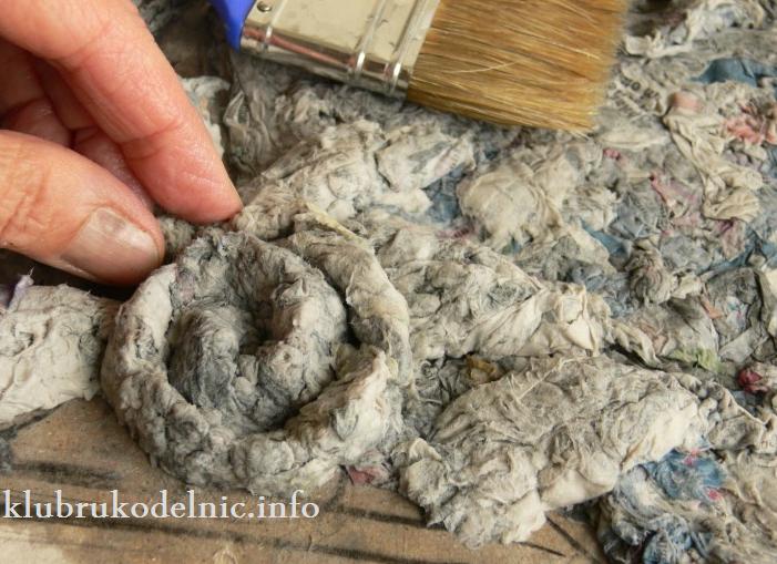 6. В случае необходимости выжатую бумагу клеим слоями, при этом каждый слой нужно промазать клеем. Для создания ,например, розочек, следует скатать бумагу валиком, который скрутить спиралью. Так получится розочка.