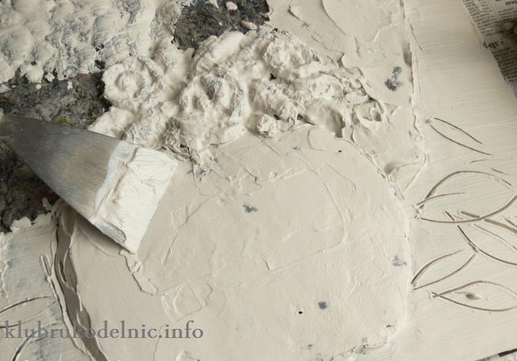 9. На фигуры цветочных горшков и чайника нанесем уже чуть загустевший алебастр шпателем. Пока гипс на рельефе мокрый, можно с ним продолжать работать. Поэтому лучше гипс готовить небольшими порциями и постепенно наносить его на нужные места.