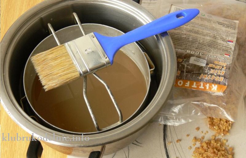 2. Для склеивания приготовьте клей. Костный клей для склеивания древесины оставим на 2 часа набухать в холодной воде в соотношении 1:1. После этого его следует поставить на водяную баню и понемногу разогревать до тех пор, пока полностью не растворится в воде.