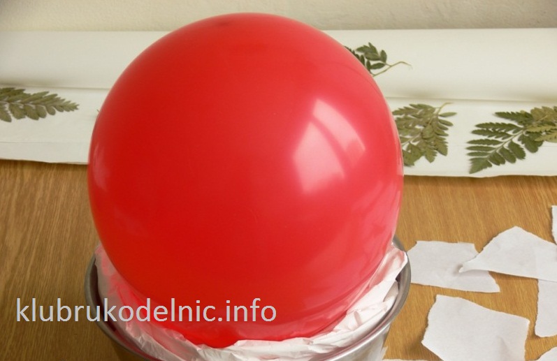 2. Надуем воздушный шарик и поставим его в глубокую миску или небольшой ведерко. Чтобы шарик держался крепко, нужно края миски обложить бумагой.