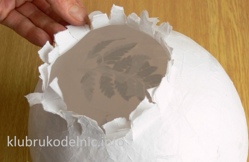 5. Рукой приглаживаем наклееные листья и покрываем другими кусочками бумаги, намоченной в крахмале. Когда все будет готово, шарик нужно повесить сушиться, например, в окно.